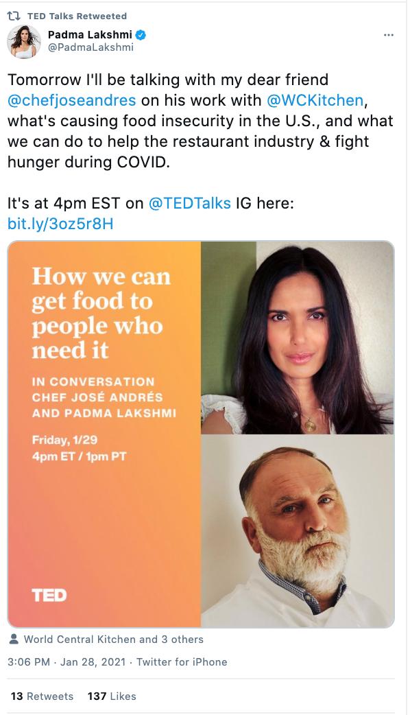 Recently we hosted Top Chef host and activist Padma Lakshmi in conversation with World Central Kitchen founder Chef José Andrés.